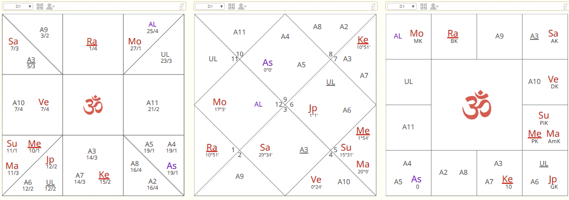 In case 1, 9th Bhāva from the Kārakāmśa is Vṛṣabha and there is no Graha in it, we will take rulership. Śukra rules over Vṛṣabha and becomes Dharma Devatā, placed in 3rd Bhāva from Kārakāmśa and in 12th from Navāṁśa Lagna.