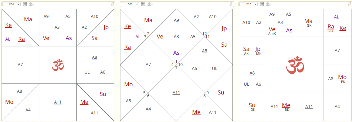 Who is the leading Deity we saw from Vimśāṁśa where the Surya, Chandra and Śukra are in trine. Śukra in Lagna shows the Bhakti yoga, Surya in 9th Bhāva shows righteous relation and great respect toward Guru and Chandra in 5th Bhāva shows that what we pray for and in this case is Lord Śrī Kṛṣṇa, which is the Devatā of Chandra.