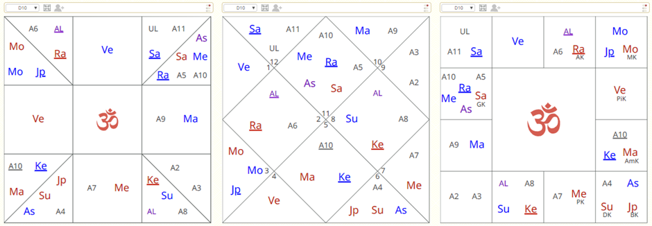 On top of that, Śani is having Graha Dṛṣṭi on Lagna in Dasāṁśa, so his decision-making in his career and job is very bad as well. Kaṇṭaka is also happening here.